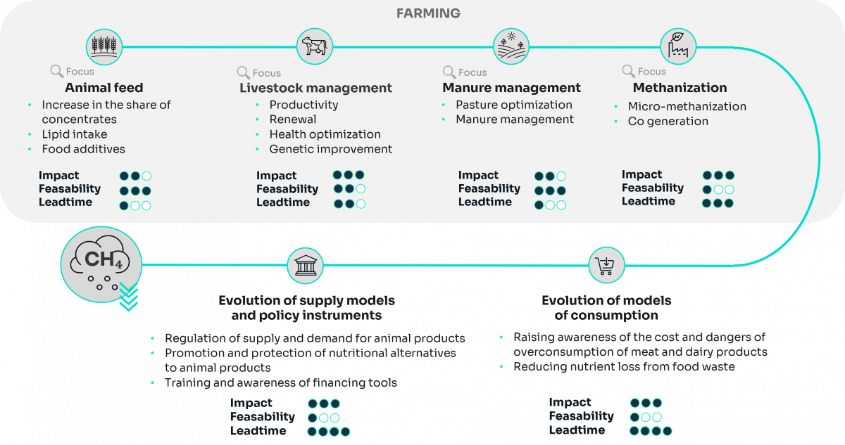 Agriculture, contrary to the waste and energy sector, does not have easily implemented turnkey solutions to limit methane emissions. Across the world, organizations have set less ambitious GHG emission reduction targets for the agriculture sector anticipating the difficulties opposed by the necessary changes in farming practices and farmed animal products demand required to reduce methane emissions. In the meantime, land use emission sequestration levers may also play an effective role as for mitigating GHG emissions.