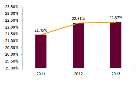 [2] Si l'on observe la moyenne « brute » de l'année 2013, en prenant en compte l'ensemble des entreprises ayant communiqué ces données en 2013, la stabilisation de la part des salariés de plus de 50 ans se confirme et s'élève à 22,23% (légère diminution).