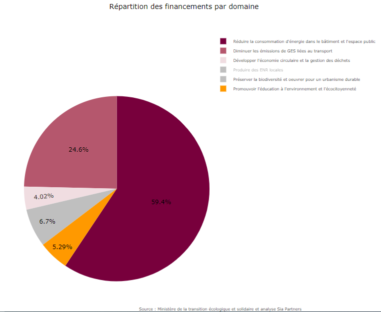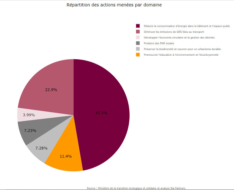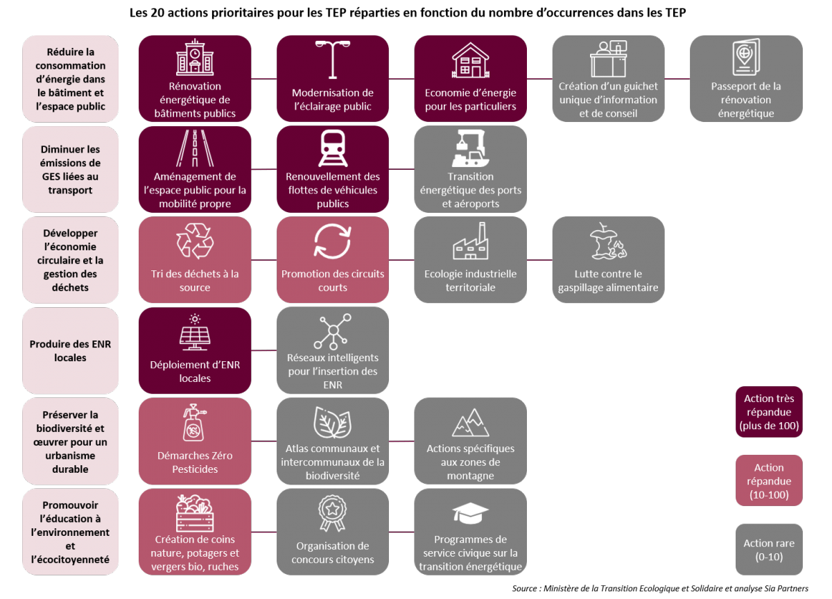 Le constat est sans appel : les projets fleurissent partout en France dans des TEP dont le nombre a largement augmenté depuis la création du processus. Au total, les territoires ont investi près de 650 M€ dans ces initiatives, dont 311M€ de subventions de la part de l’Etat. En revanche, le CLER – Réseau pour la transition énergétique, estime que 5 actions sur les 20 susmentionnées monopolisent à elles seules 74% des actions menées et 82% des financements : la rénovation énergétique des bâtiments publics, l’aménagement des espaces publics pour favoriser la mobilité propre, la modernisation de l’éclairage public, le renouvellement des véhicules publics et le développement des énergies renouvelables locales. Ces actions relèvent donc majoritairement du domaine de la réduction de consommation des bâtiments et de l’espace public.