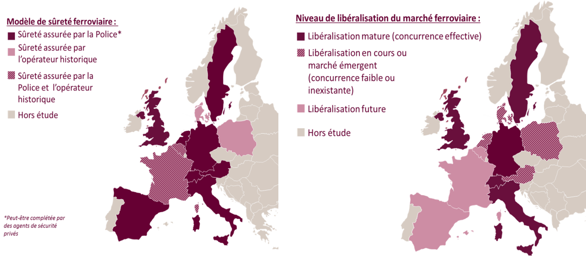 L’organisation des dispositifs de sûreté varie en fonction des pays. Ils peuvent être organisés par les forces de police, par l’opérateur historique et majoritaire sur le réseau national ou par une organisation commune. Le rattachement des équipes de sûreté est fonction de plusieurs paramètres : l’état de séparation organisationnelle entre le gestionnaire d’infrastructure et les opérateurs ferroviaires, le degré d’ouverture du marché national à la concurrence et le rattachement historique des équipes de sûreté.