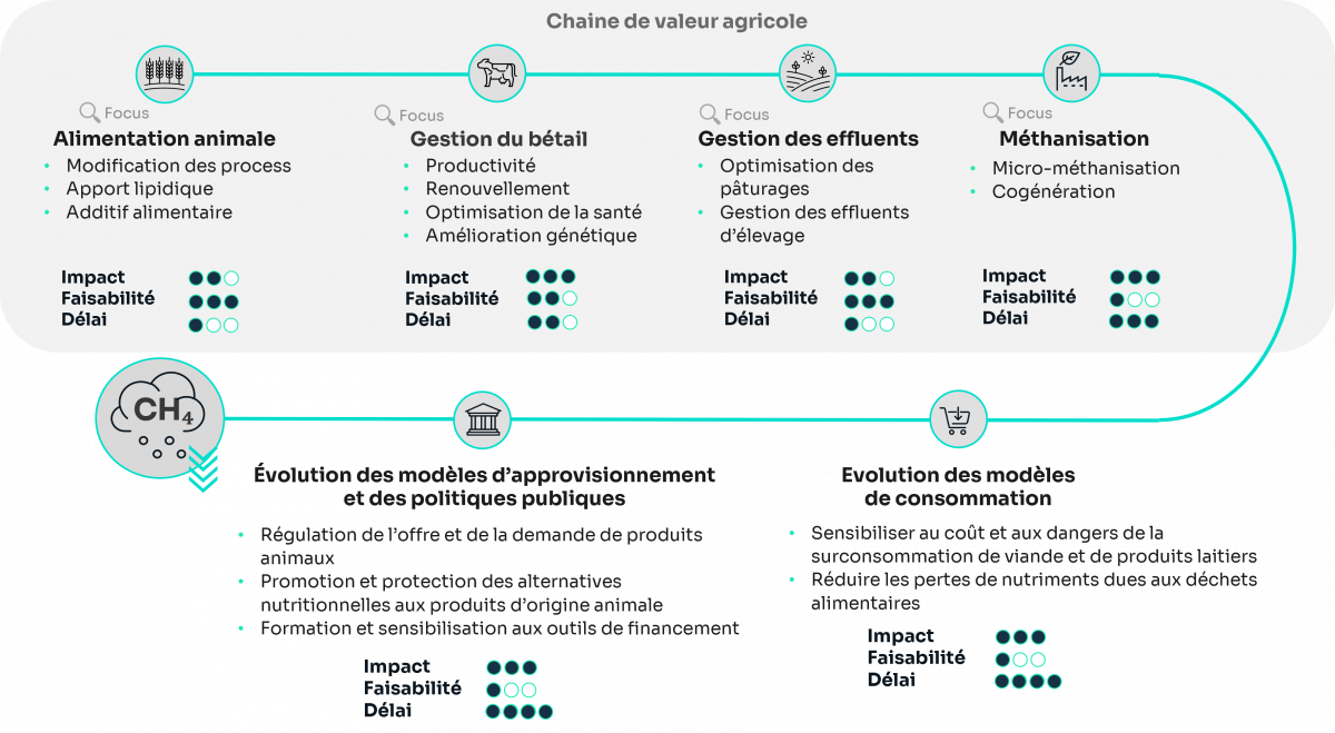 Dans notre étude, nous présentons également les principaux leviers à prendre en compte pour réduire les émissions de méthane du secteur agricole qui se séparent en deux catégories : les solutions impactant les pratiques d'élevage et les évolutions du contexte législatif et des modèles économiques de consommation.